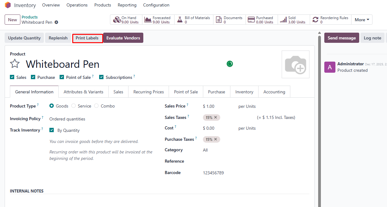 In Odoo 18 Enterprise, the Print Label button allows users to quickly generate and print product labels directly from the product form. These labels are commonly used for barcodes, SKU identification, pricing, making inventory handling faster and more accurate.