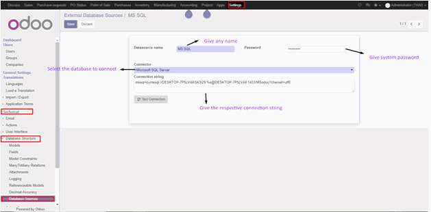 5. Go to Settings -> Activate Developer Mode. Go to Settings -> Technical -> Database Sources